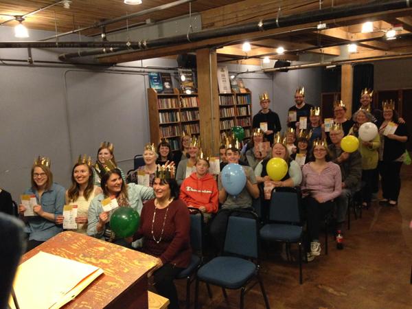 Just back from the Seattle Independent Bookstore Day Grand Champions fete at Elliott Bay. They gave us crowns! And cake. And our stamped passports back, which delighted everyone. It was great fun to meet other Bookstore Day adventurers and compare routes and bookstore notes. Grand Champs total was 42, and an additional 117 made it to three or more stores. Clearly, Seattle readers rock.