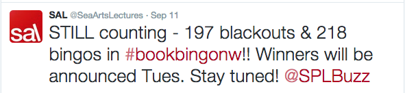 Plus! apparently I have a 1 in 197 chance at winning that prize the SPL and Seattle Arts & Lectures folks will be drawing for this Tuesday— season tickets to SAL + a library of books by the speakers. (And 218 bingos are in for the drawing for a gift certificate to a local bookstore.) It is such a delight to be living in such a book-centric city.