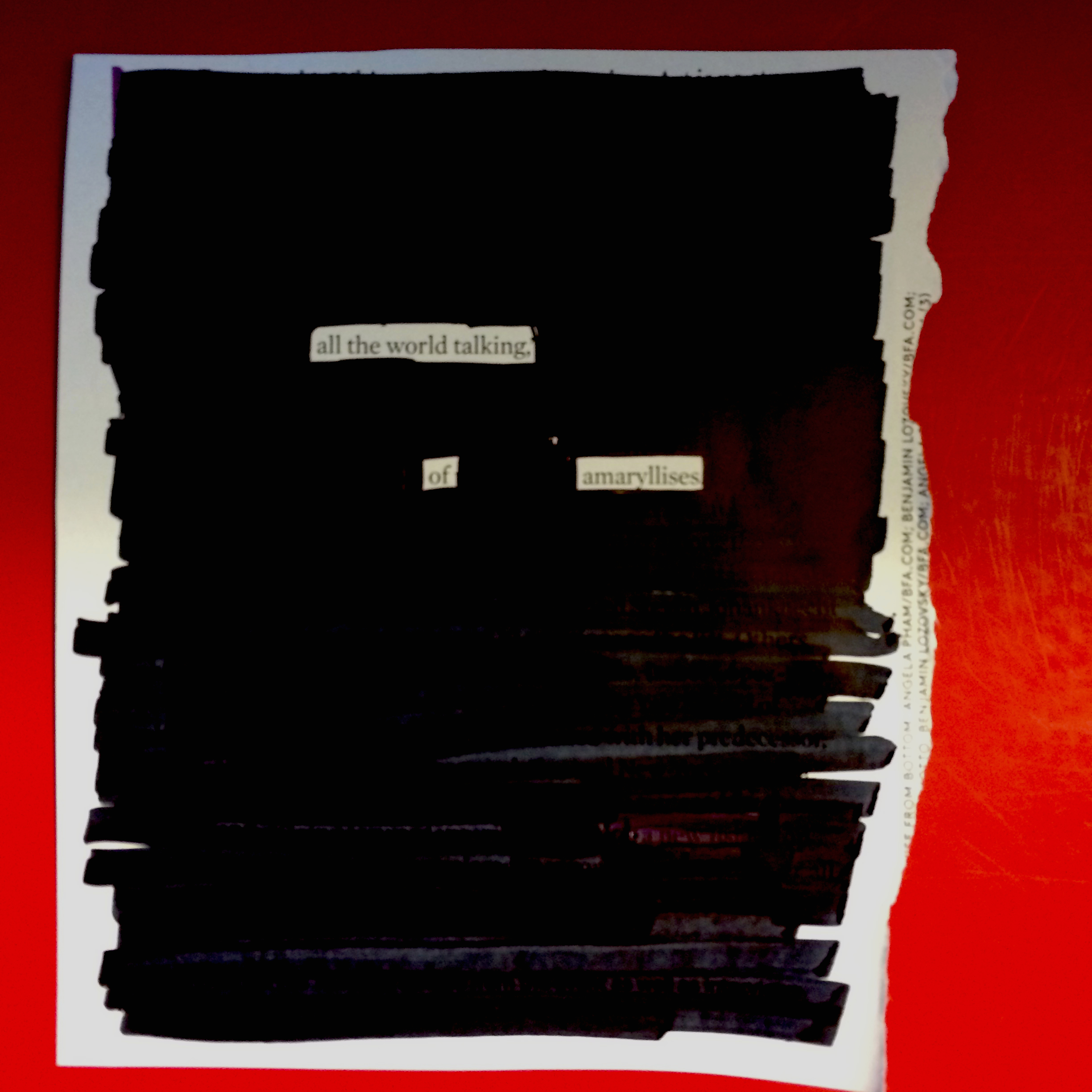 I got really into doing erasure/blackout poems in July. I’d never tried them before really, but I was doing a 30-poems-in-30-days challenge with some friends, and wanted to participate more days of the month than not—but I didn’t have the poetry-emergy-wherewithal to write from scratch everyday. Blackout poems, I discovered, were a really fun and rewarding way to still participate in the making of poetry without having the burden of the totally blank page.