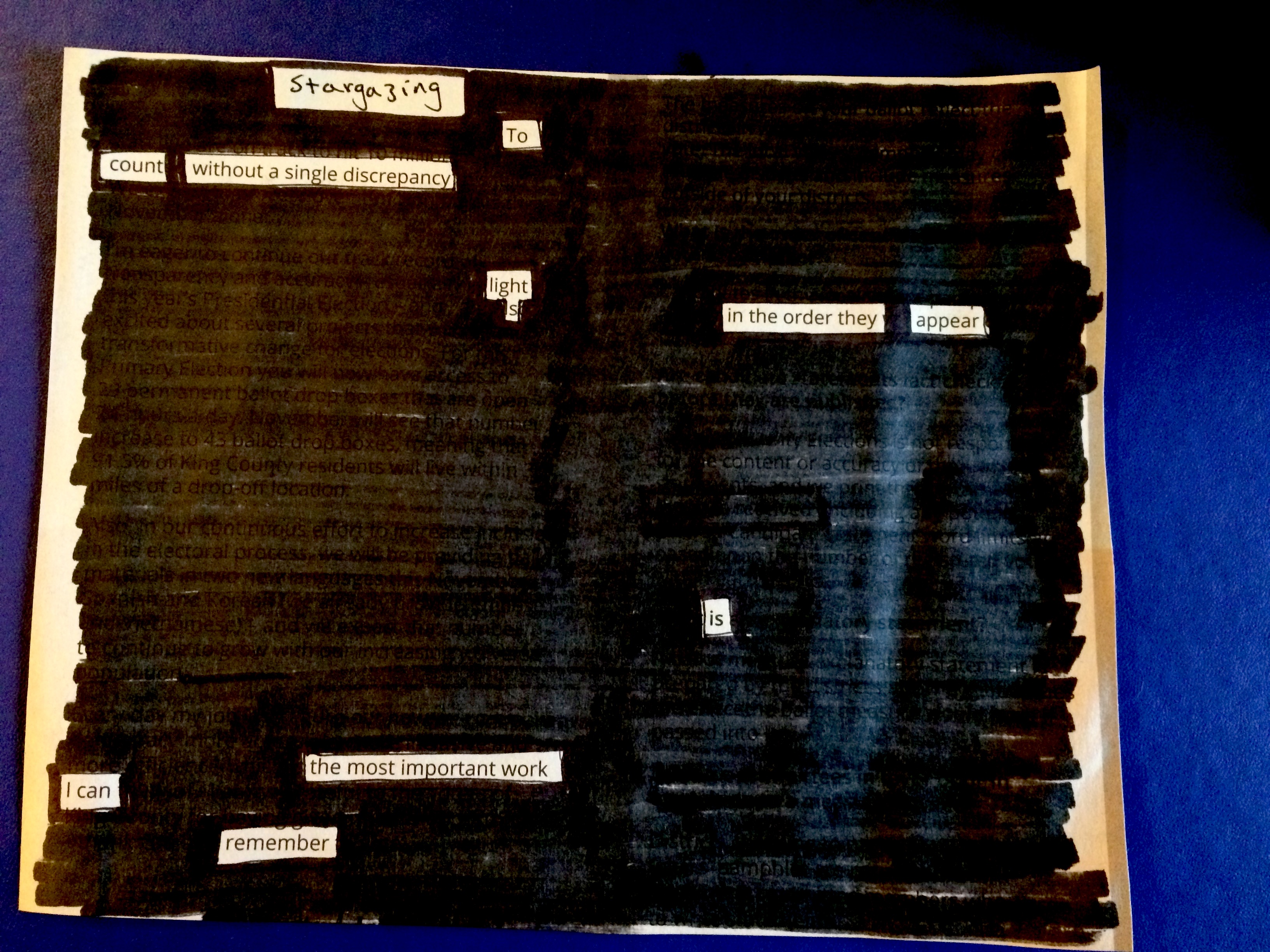 I’ve gotten quite into it, and have some larger erasure projects in mind for the winter when being outside isn’t so tempting. But in the meantime, I’m thoroughly enjoying the occasional foray of taking a Sharpie to a magazine. Entertainment Weekly is surprisingly fecund (though Us Weekly is not), and Money Magazine, Elle Decor, Architectural Digest and House Beautiful work well. The New Yorker’s vocabulary of course makes it a fantastic source too (and now I finally know what to do with all those years-old New Yorkers I am never going to get around to reading!). But the most fun was definitely the night I used the King County Voters pamphlet.