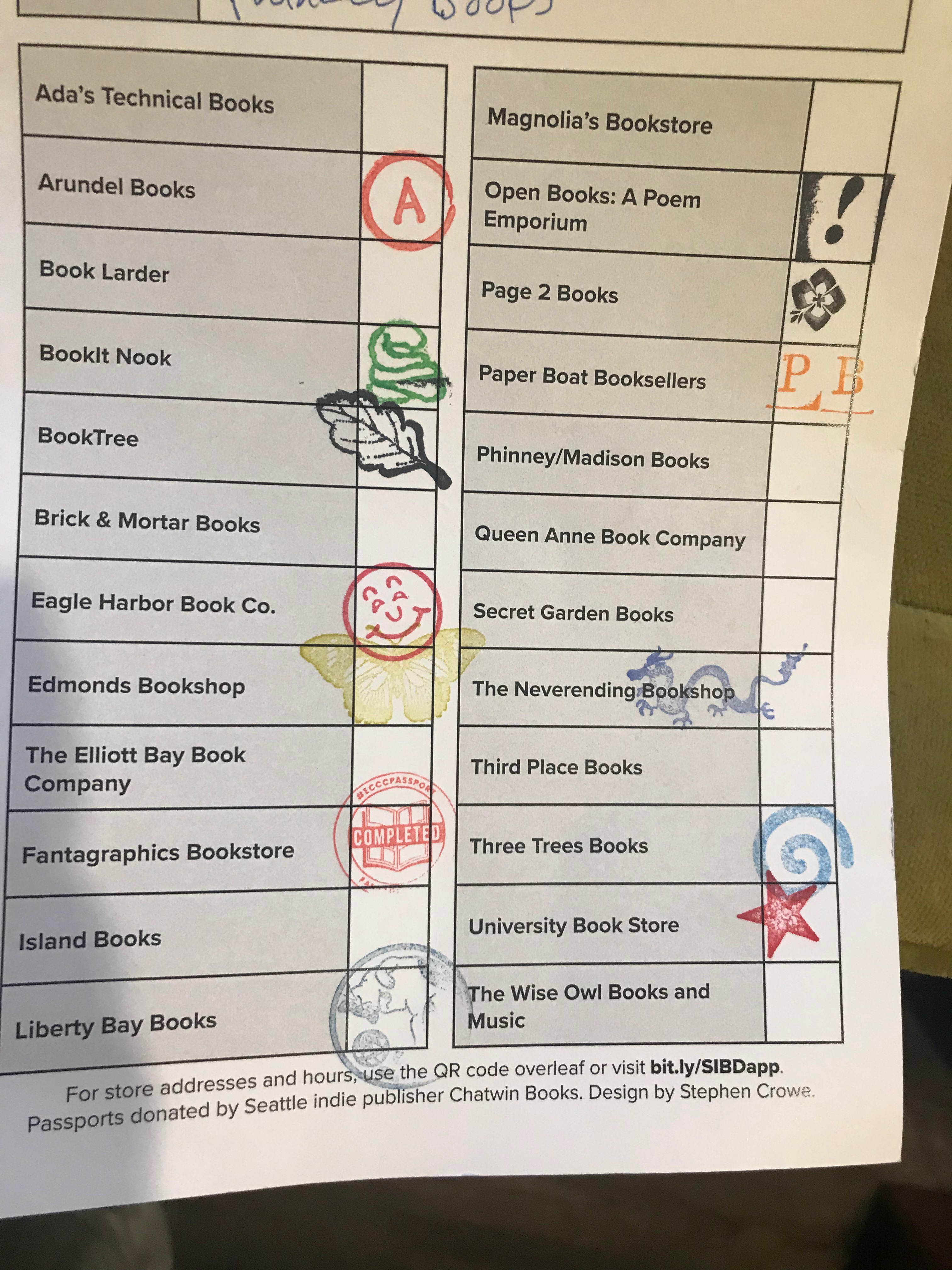 As usual, my mom and I wouldn’t miss Bookstore Day for the world (see our previous adventures starting in 2015 here) so we were back at it April 30th for the Seattle Independent Bookstore Day passport challenge, which this year consists of going to 24 (24!!) bookstores in 10 days, for which we will be rewarded with one 25% off discount at each of the 24 (24!!) stores. We’re doing it over 2 Saturdays.